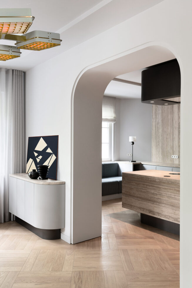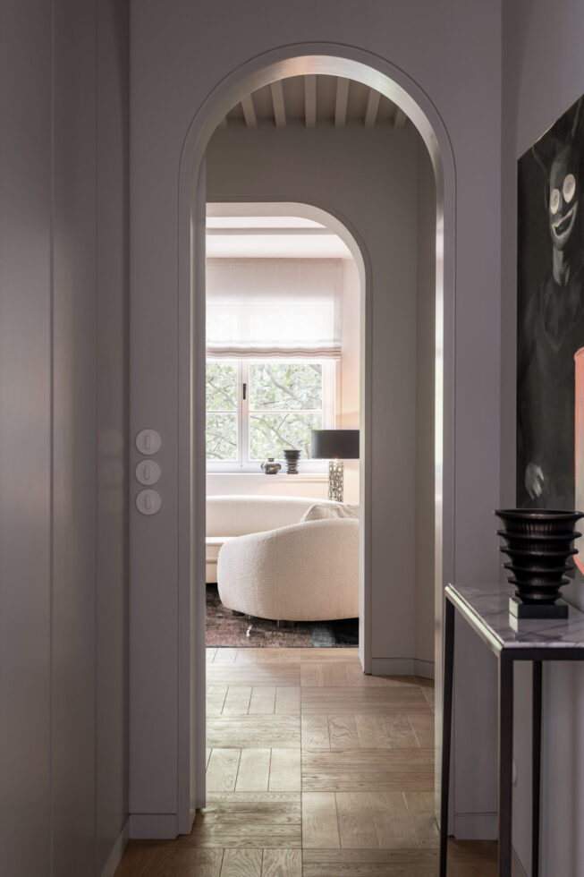Elegant round arches as a recurring design element contrast with simple straight lines.