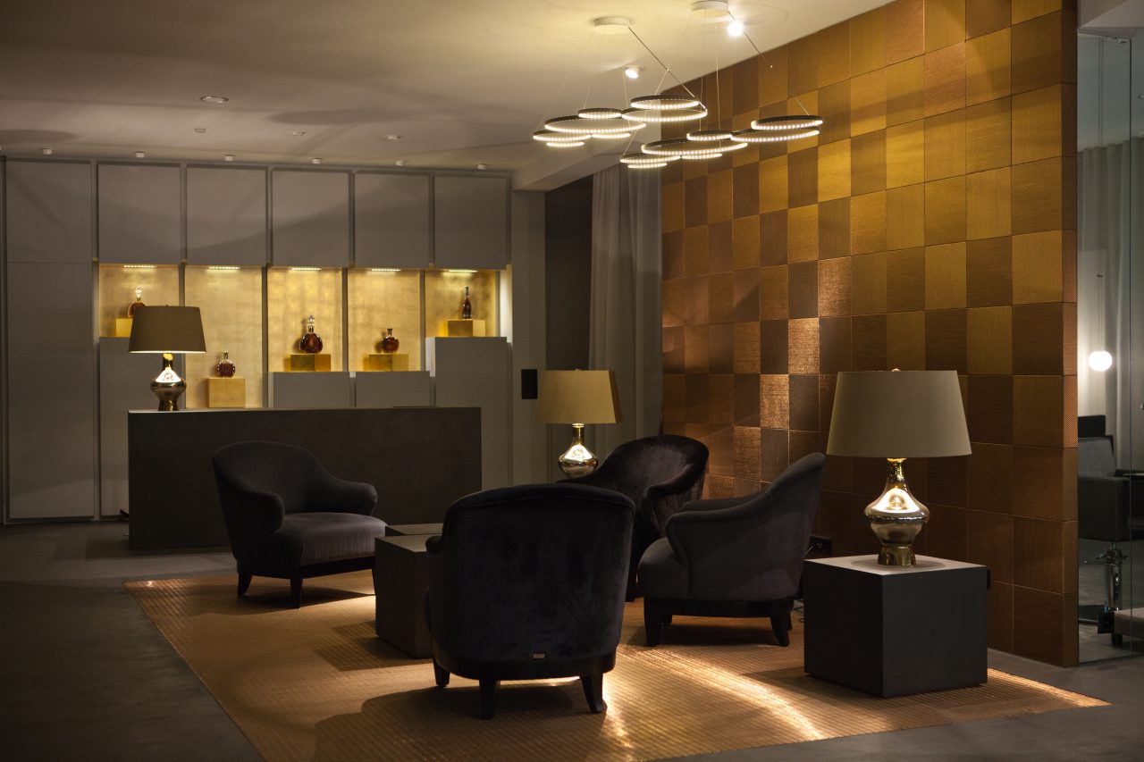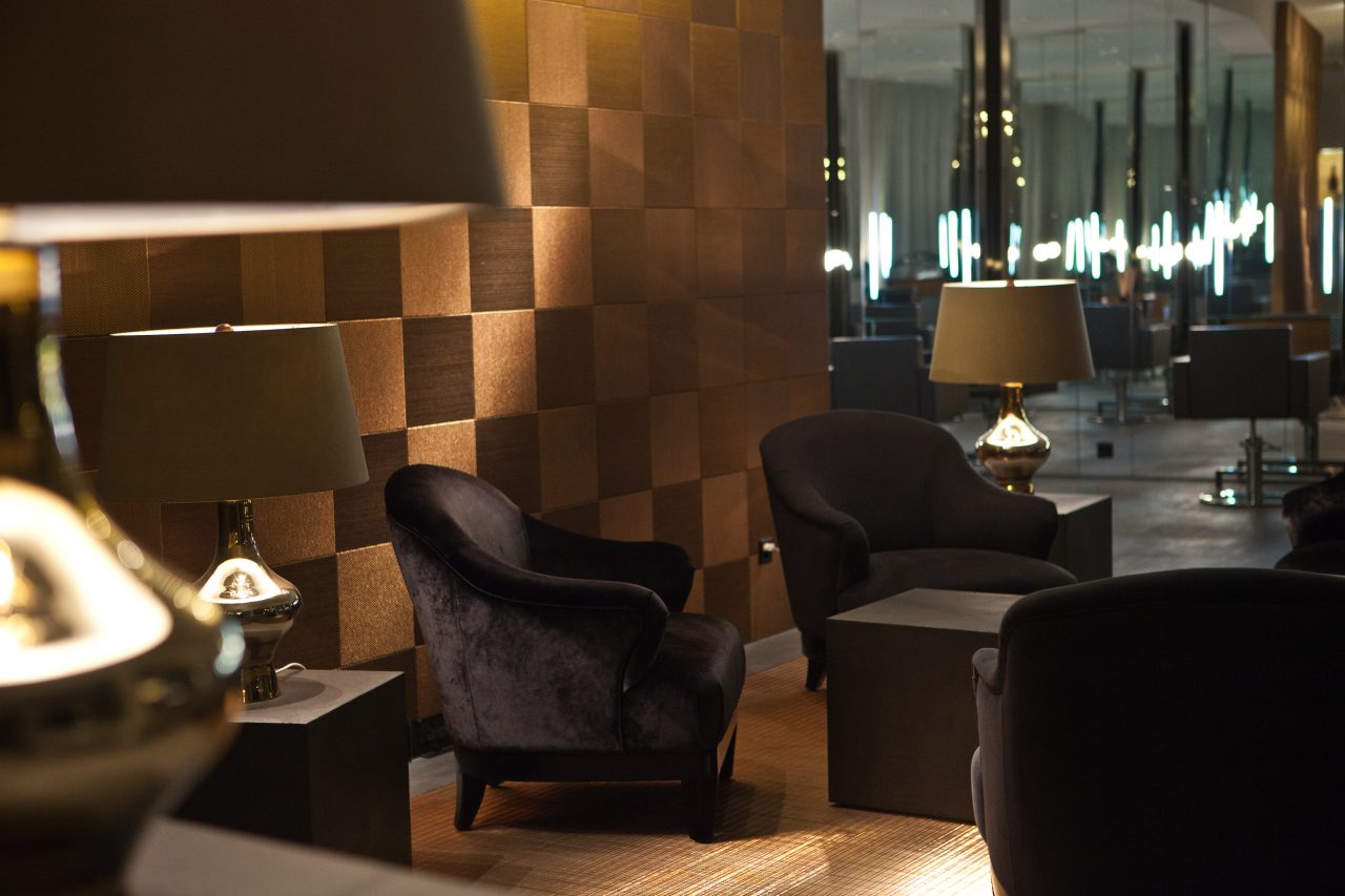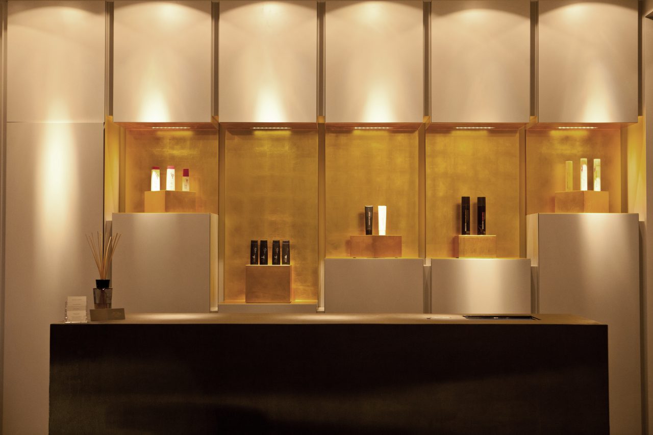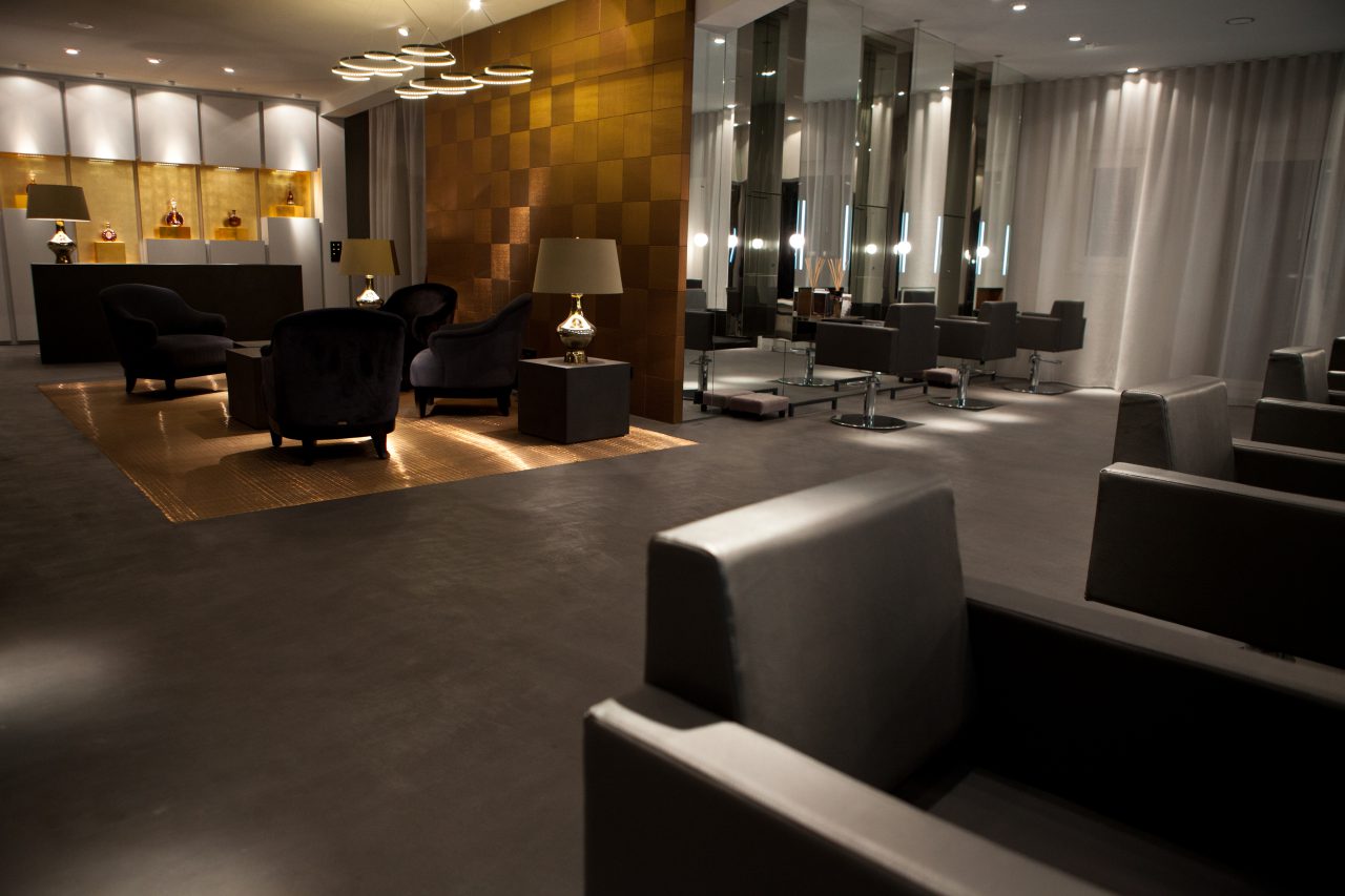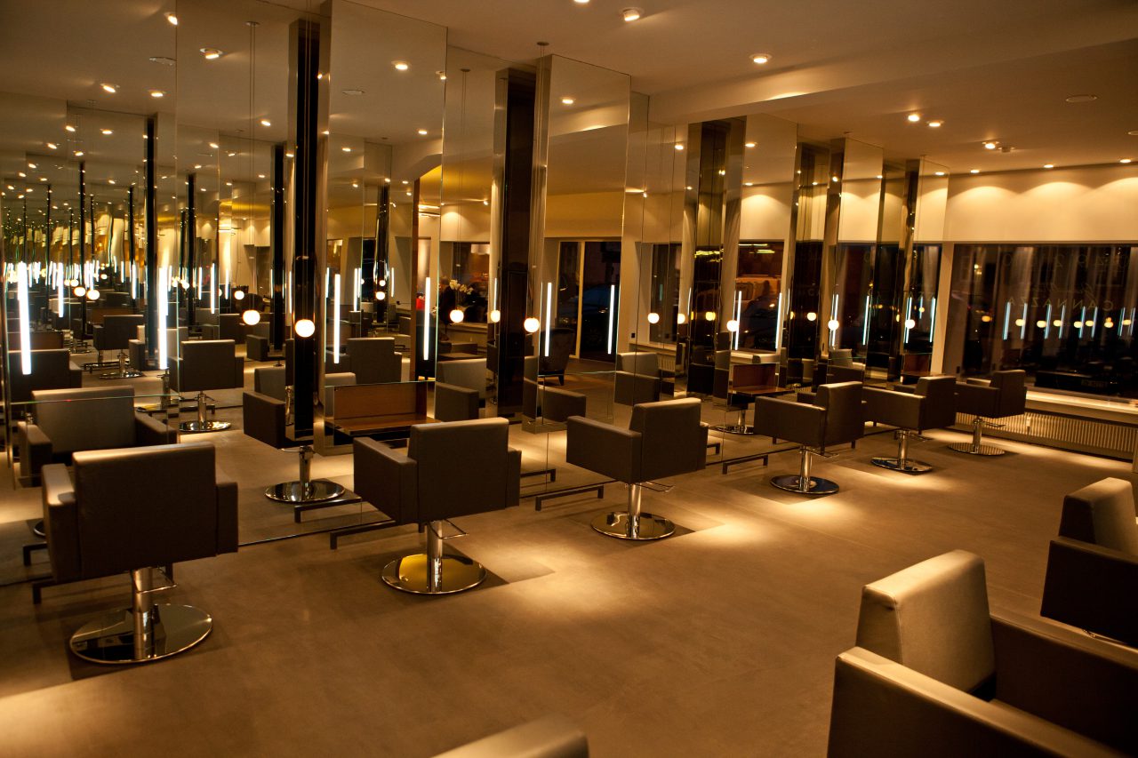 The effect of the “infinity mirror” occurs when you find yourself between two opposing mirrors. It is often found in hairdressing salons. This exciting phenomenon was taken to the extreme by incorporating a second layer of mirrors. What also stands out here is the exposed screed floor with recessed stainless steel carpet in the entrance area.