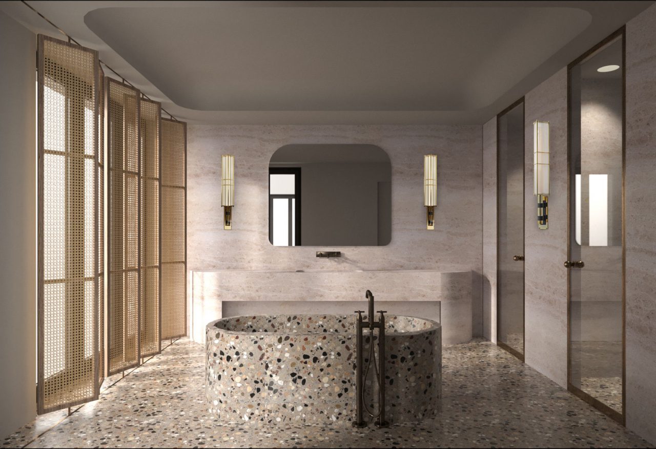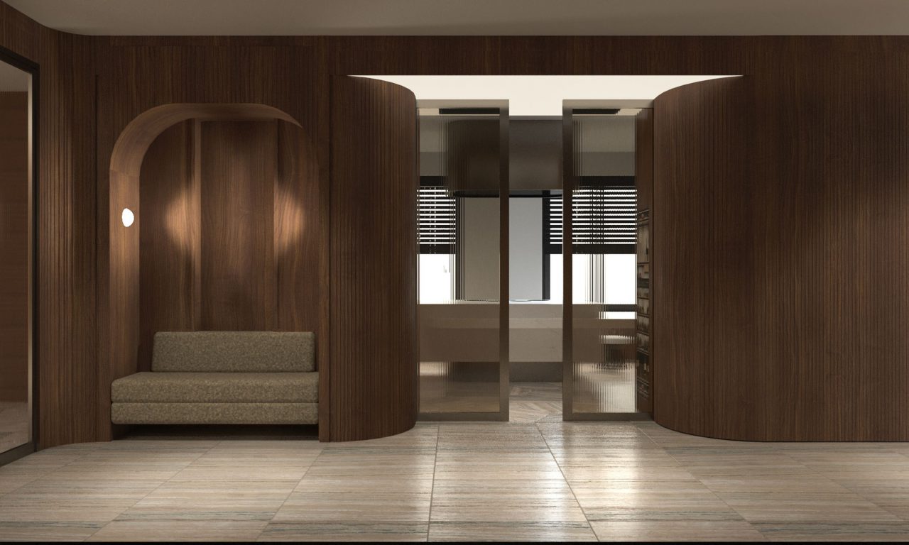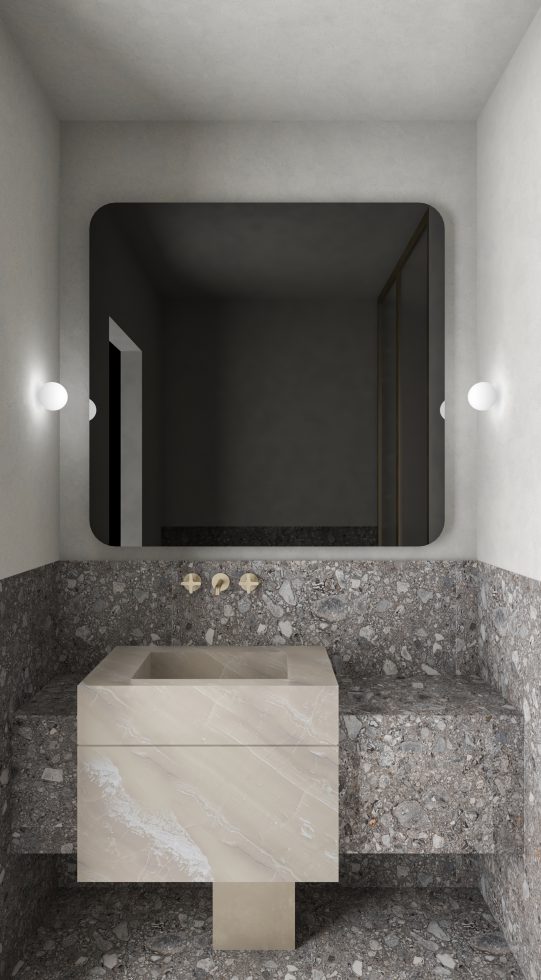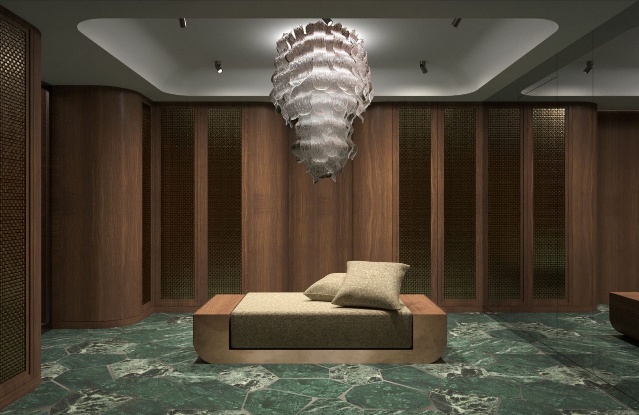 Just like the architecture, the simple yet timeless elegance of the interior design, which is based both on a small number of formal elements that are nevertheless characteristic of the style (for example, the “rounded corners” and the round arches), and on extremely high-quality and immaculate surfaces (such as walnut wood, travertine & terrazzo), captivates all who encounter it.