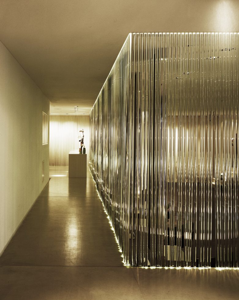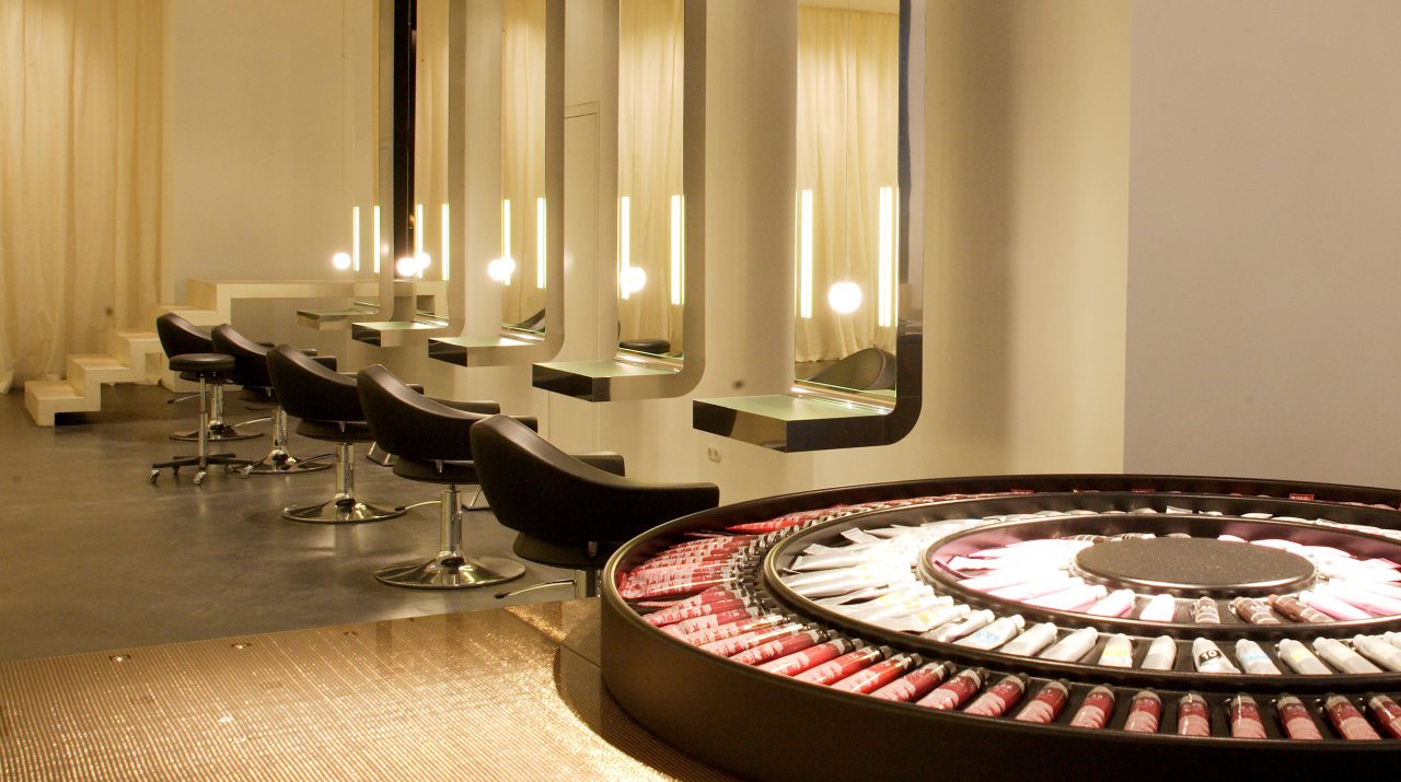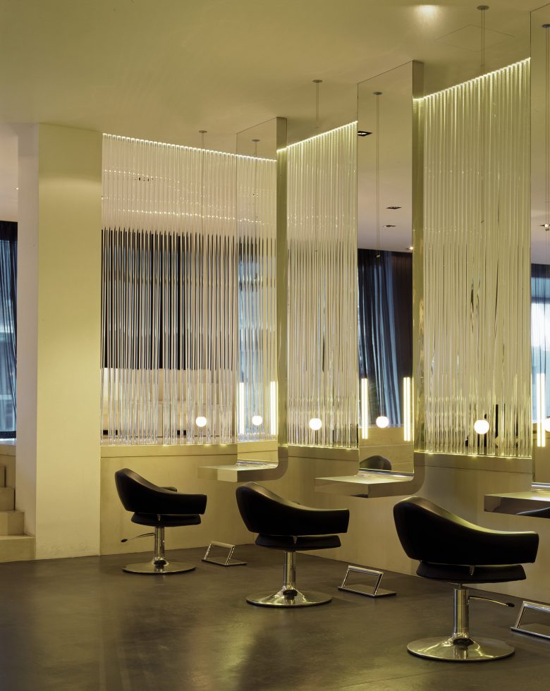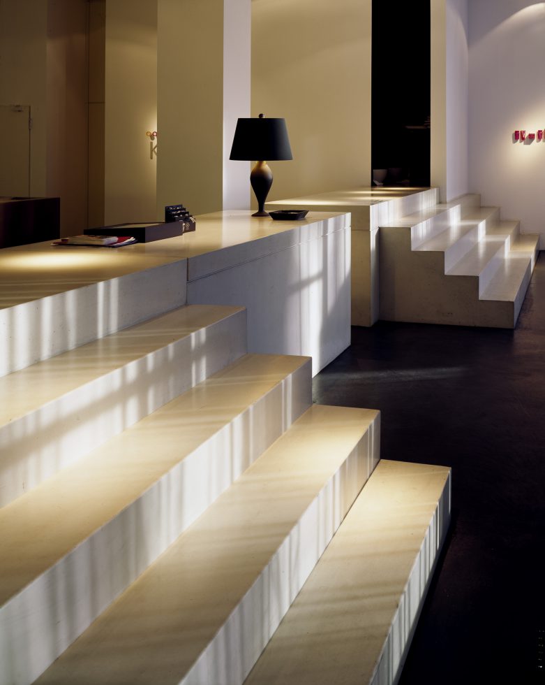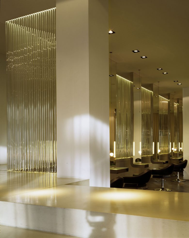The premises are located directly at Berlin’s Gendarmenmarkt and include a hairdressing salon, a shop and a café. The interior is based on simple, smooth surfaces that, in combination with the sensitively designed lighting, create an elegant stage. Highlights include the monolithic bar sculpture and the heightened walkway, as well as the illuminated acrylic glass tubes to spatially separate the different functional areas.