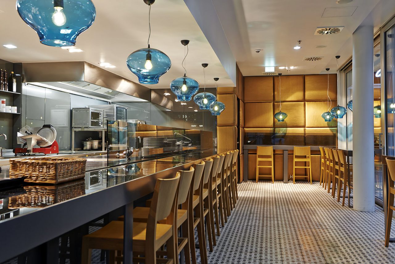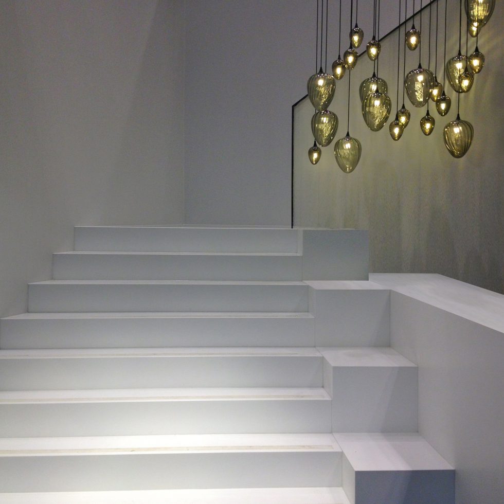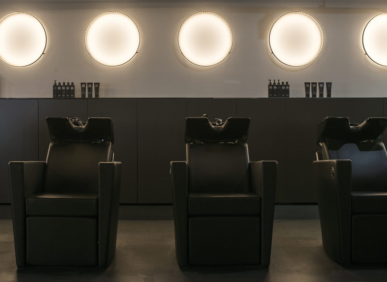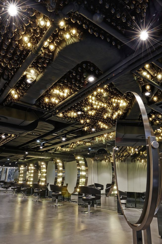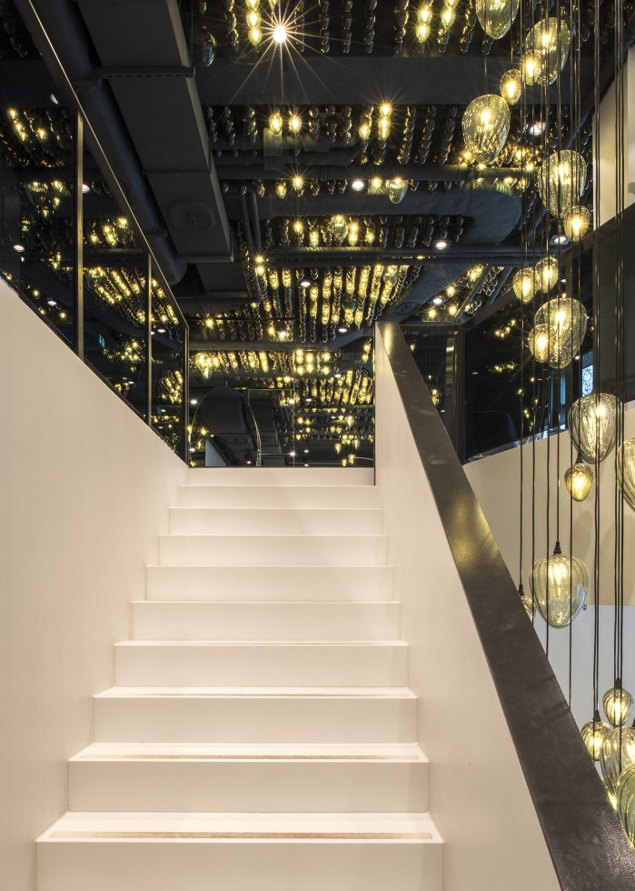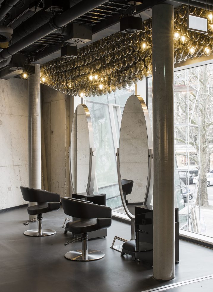 A hairdressing salon, beauty cubicles, retail space and bistro are spread over two floors here. The connecting element is the extraordinary ceiling of lights: hundreds of light fittings, which were mouth-blown in Murano, Venice especially for this project, lead from the ground floor over the sculptural staircase up to the upper floor and create an unmistakable and identity-establishing ambience.