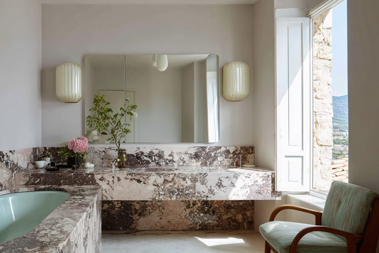 We also completely renovated all five bathrooms and the kitchen, working closely with our carpenter Valerio Aliprandi, who was, as always, perfect for all the carpentry and marble work. For the romantico bathroom we use the calacatta Davinci marble. The slightly mint green bathtub was found before the master bathroom renovation and we reused it.