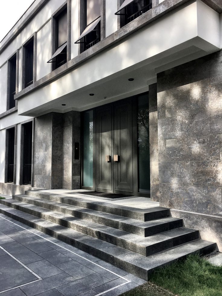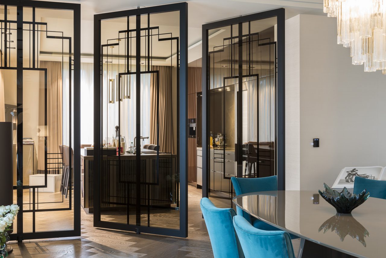 New build of a prestigious city villa with a large wellness area and spacious underground garage. The exclusive interior features all kinds of custom-made elements. One example is the pivot door system between the kitchen and dining room: The three solid door leaves, consisting of a steel frame with glass infill, can be turned on their own axis.